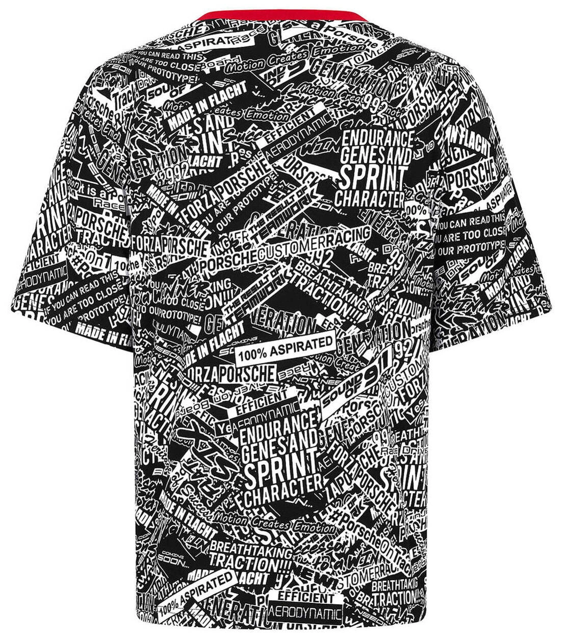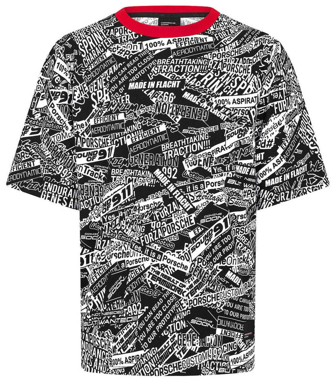 The Porsche Motorsport Statement Oversized t-shirt features a bold all-over print, capturing words and phrases synonymous with Porsche Motorsport, giving the shirt a striking look.