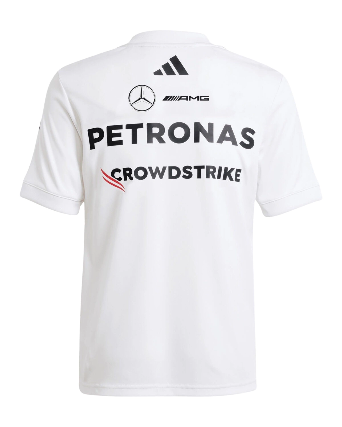 Youth version of the official Mercedes-AMG Petronas Formula One Team shirt by adidas for the 2025 season. This shirt is an exact replica of the outfit worn by professional drivers, allowing young fans to feel part of the team while supporting their favorite driver. Thanks to AEROREADY technology, which regulates moisture, the shirt provides breathable comfort both while watching races and playing outdoors.