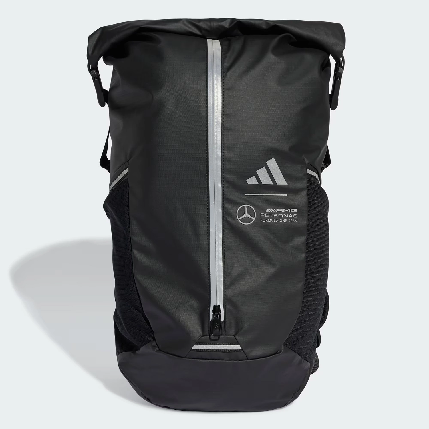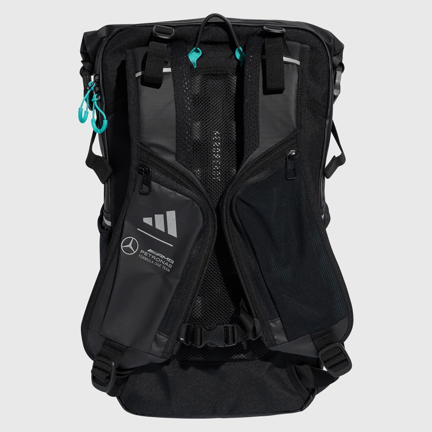 The official Mercedes-AMG Petronas Formula One Team backpack by adidas Motorsports is packed with technology. The unique full-length front zipper and roll-top opening system make it suitable for carrying all types of gear, while the AEROREADY technology back support and padded straps ensure comfort when carrying heavy loads.