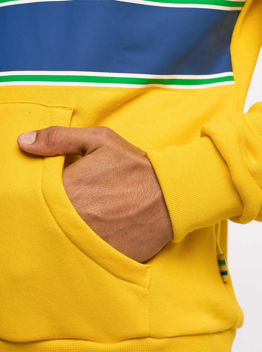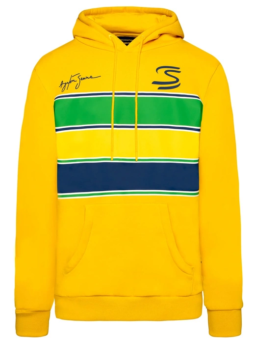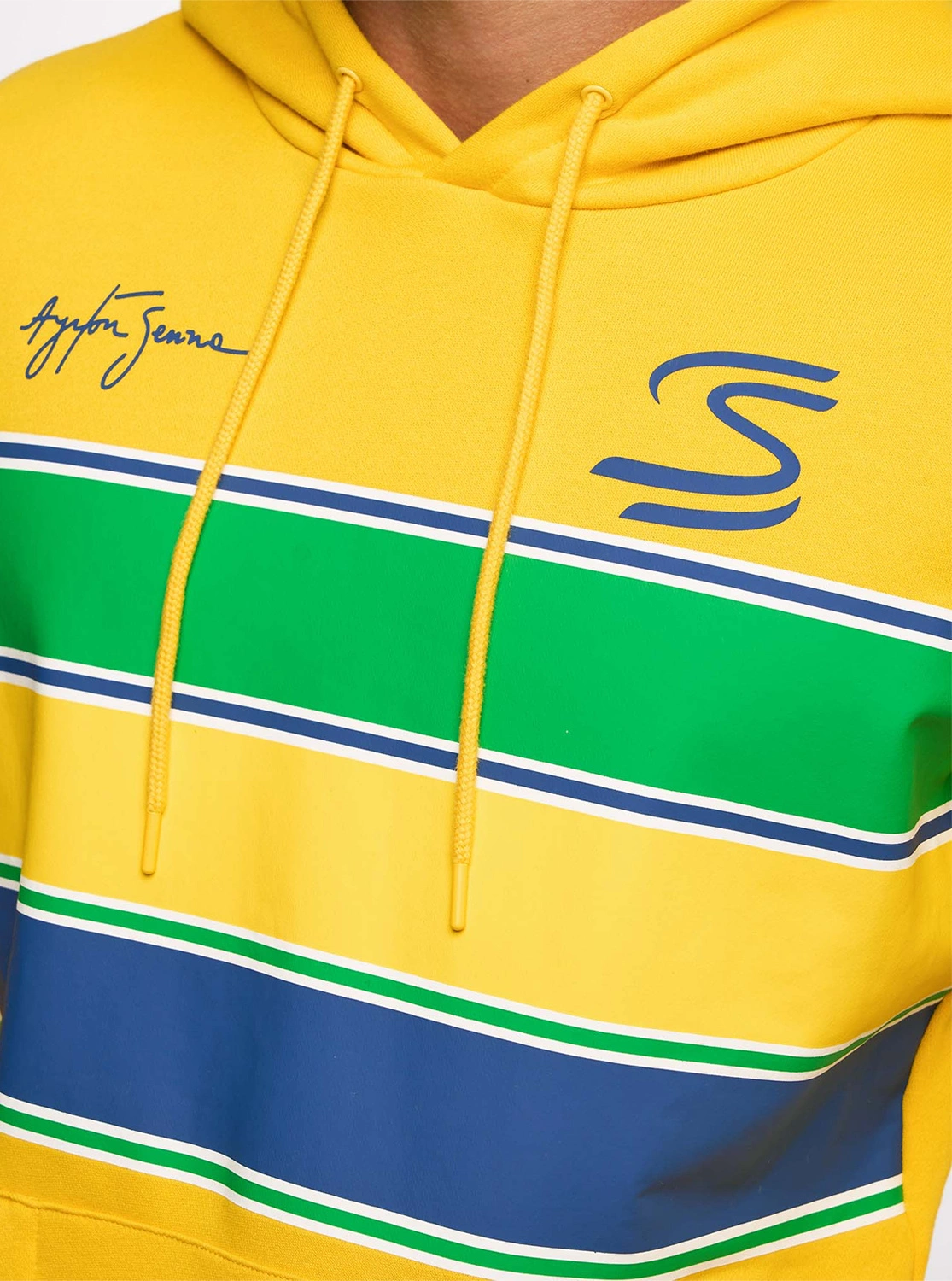 The Ayrton Senna Stripe Hoodie is inspired by the legendary helmet design of the Brazilian Formula 1 champion. With vibrant colors and a bold style, it's a standout piece for every motorsport enthusiast.