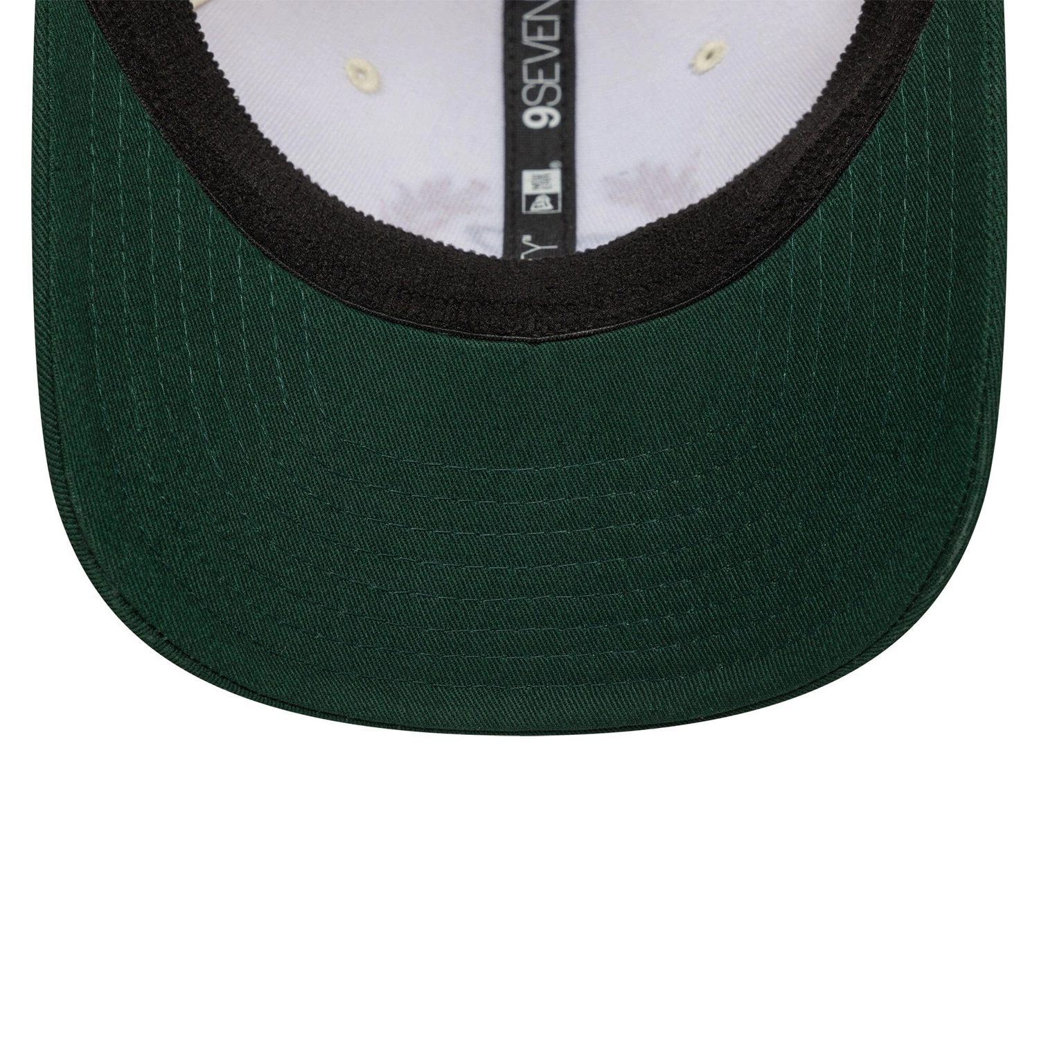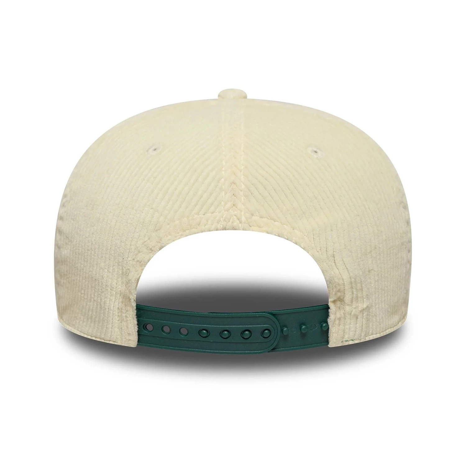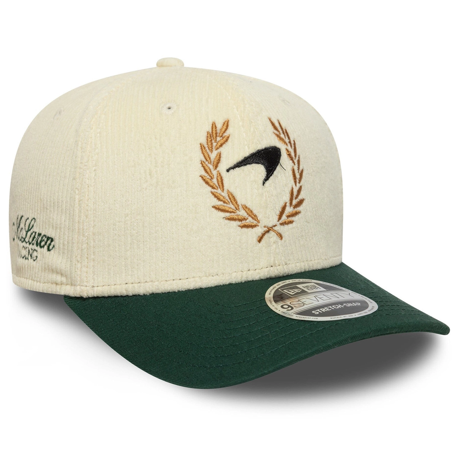 Official McLaren F1 Team cap by New Era, featuring a cream-colored corduroy crown paired with a contrasting green curved brim. This structured design includes an adjustable strap for a comfortable and personalized fit. A standout accessory for Formula 1 fans and passionate McLaren supporters.